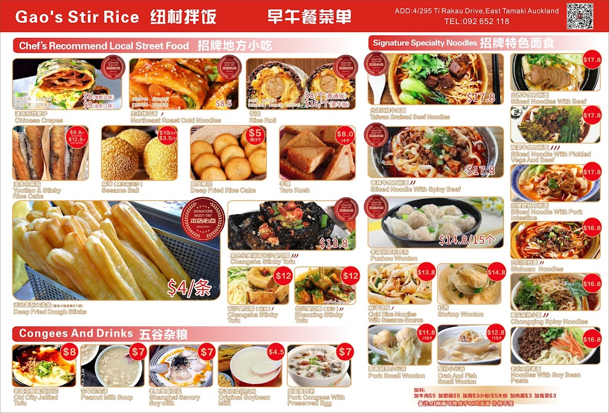 The menu at Gao's Stir Rice offers a thoughtful selection of traditional Mandarin dishes that invite casual, comforting dining throughout the day. Designed around familiar favourites and regional specialties, the offerings range from hearty noodle bowls to delicate soup dumplings, making it a spot well-suited for both quick bites and more leisurely meals.